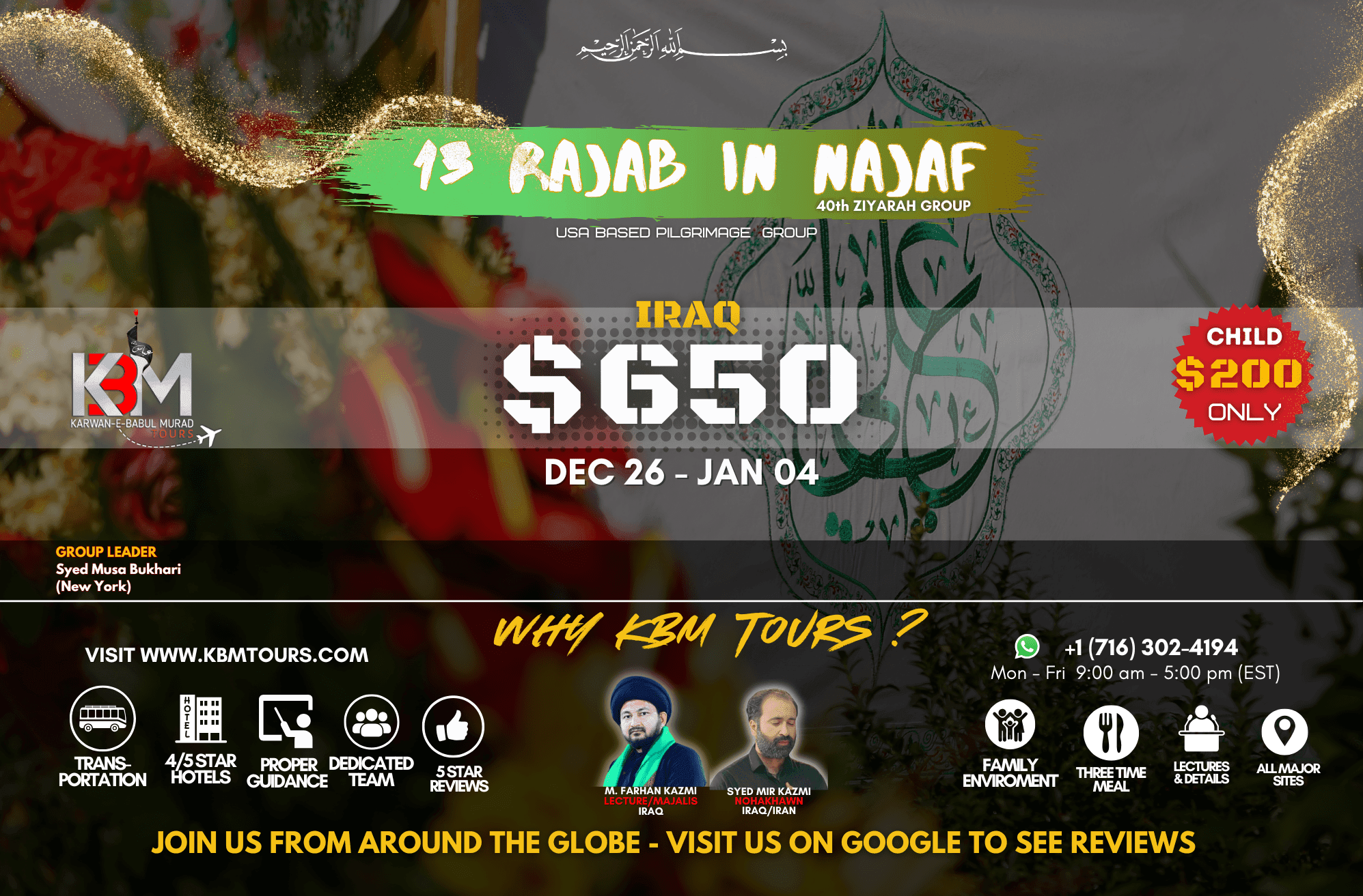 Based on 166 reviews Very nice Ziarat and Maulana sahib's information about Imam, Ashab, Maqam in detail very informative. Meher Naz KBM Tours , having their highly devoted team are providing outclass spiritual journey services. Making maximum efforts to keep their group comfortable and perform/ learn as much as religious activities. Highly recomended. Wel wishesh for the entire Team. Shabeeh Abbas Alhamdulilallah. Glad to choose KBM tours for our first time ziyarat. Had a great experience with them. My mom got sick during ziyarat and kbm tours and their volunteers took great care of her and assist her in all her ziyarat. Mehwish Zehra My family and I visited from GA, USA. Had a great spiritual experience and journey. Ziaarats and maqamaats of Iraq were covered. Molana gave heart warming speeches throughout the journey. Time management was perfect, especially for Kazmain / Samarra. We wish them all the prayers in this virtuous work that KBM is doing and highly recommend them. Syed Askari Hasan This is farooq Khan, I came from New York, USA. This was my first trip to Iraq. I did Saudia and Iraq December 2024 trip, Kbm tours is amazing Well managed. Everything is on time. The group leader is a very nice person. The hotels are amazing!!! I am writing this review so people can know how good this group is and you should definitely come with them. Kbm tours team is also very well organized, the group was always on time. And the prices are very reasonable. Inshallah I am always coming with Kbm tours again. 10 stars from me and my family ! Must go on ziyarah with them 🙏 Farooq Khan I recently had the privilege of going on my first Umrah trip with KBM Tours, and it was truly a magical experience. From the start, Musa bhai made us feel completely at ease, especially as a mom traveling with two young children (2.5 year old and 8 months). He was incredibly thoughtful, helping with my son and being so patient when he played around on the bus. Musa bhai also went above and beyond when it came to sharing knowledge. He answered every question I had about the history of the sites we visited, and his insights really deepened my understanding of the significance of each place. The scholar he brought along was equally amazing — so knowledgeable and approachable, it honestly felt like we were traveling with family. One of the highlights was that the scholar even offered to assist us with performing a second Umrah, showing the genuine care they have for their guests. This thoughtful, personal touch made all the difference. I’m already planning my next trip with KBM Tours, this time to Karbala. I’m so glad I came across this wonderful group, and I highly recommend them for anyone looking to make their pilgrimage a meaningful and comfortable experience. Shanawar Manzoor I went to Arbaeen in 2024 with KBM, My Wife and daughter went to Iraq & Iran with KBM in May 24, very good experience, Mola salamat rakhay Musa, Tauqeer & Molana Farhan Kazmi ko, they surpassed all my expectations. It was well organized and they delivered what they promised. Inshallah will go again with KBM....highly recommended. Fayyaz Hussain I just performed my first Umrah, and I couldn’t be happier with KBM Tours. My journey started in Medina, and a few days later, we traveled to Mecca to perform Umrah. Everything was perfectly organized, from transportation to accommodations, making the experience smooth and stress-free. The professionalism and attention to detail ensured I could focus entirely on my journey. I’m truly happy I chose KBM Tours and highly recommend them to anyone planning their Umrah. They made this journey unforgettable. Alhamdulillah! Shehzeenah Hassan I’ve traveled multiple times with KBM. I’m based out of the NJ area and traveling with them has always been smooth. The groups always have a family dynamic which makes the experience more memorable. Brother Musa organizes everything perfectly and accommodates to everything you may need! Aleen Kirmani